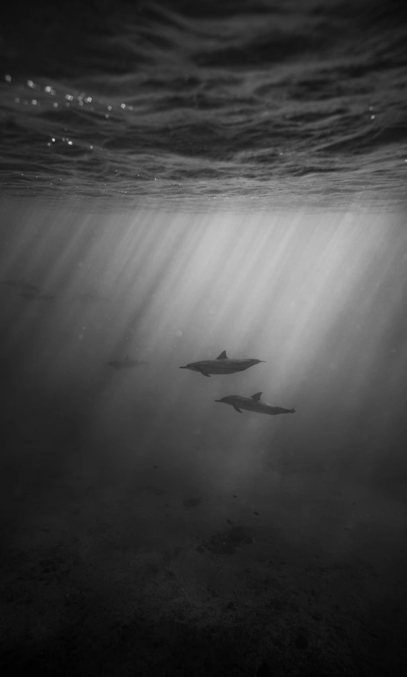 Een zwart-wit behang met dolfijnen die onder water zwemmen op een zonnige dag brengt rust en beweging tegelijk. De speelse dieren en de zachte lichtinval zorgen voor een frisse en elegante uitstraling. Perfect voor woonkamers, badkamers of slaapkamers. Dit ontwerp geeft de ruimte een moderne en kalme sfeer. Ons behang wordt altijd op maat gemaakt. Vul eenvoudig jouw maten in en ons systeem berekent automatisch de juiste hoeveelheid, zodat het perfect aansluit en de muur een blikvanger wordt.