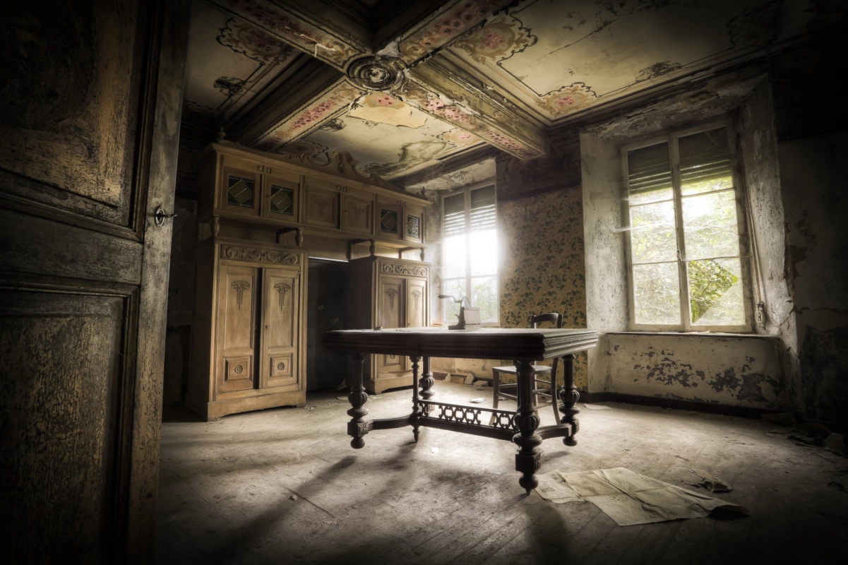 Fotobehang waarop een oude kamer is te zien van een gebouw, die vervallen is. Midden in de kamer is een tafel te zien en links in de kamer is een kast te zien. Bij de ramen zijn spinnenwebben te zien. Wil jij dit behang van een oude kamer op jouw muur? Dit behang is mooi voor bijvoorbeeld in de woonkamer, keuken, kantoor, bar, hal of eetkamer. Bij ons kun je deze afbeelding op een verschillende soorten behang laten drukken. Je kunt kiezen uit vliesbehang, twee soorten vinyl behang (textiel en leerlook), Airtex en WalltexPro. Een deel van deze materialen wordt als naadloos behang geleverd en een deel op behangrollen. Heeft jouw muur niet dezelfde verhoudingen als de foto, dan kun je ook een deel van de afbeelding gebruiken. Geef online jouw maten door en wij maken het precies voor je op maat!